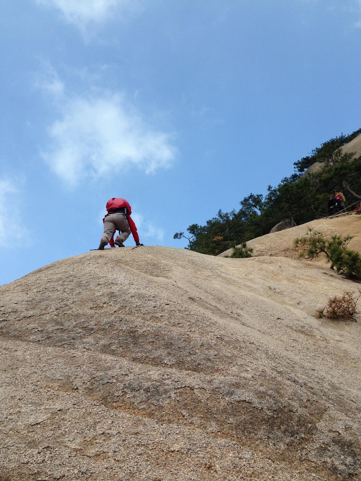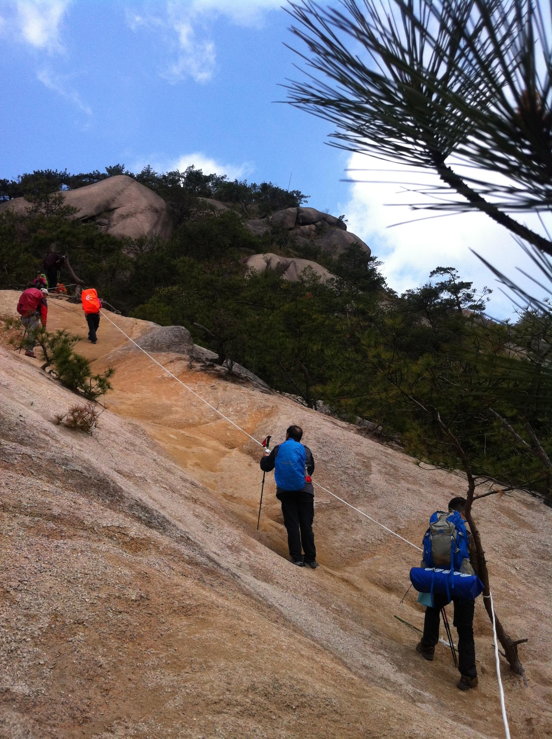 山坡上沙化的表面走在上面稍不留神就会滑倒,有的地方非得借助绳索才能攀上去。