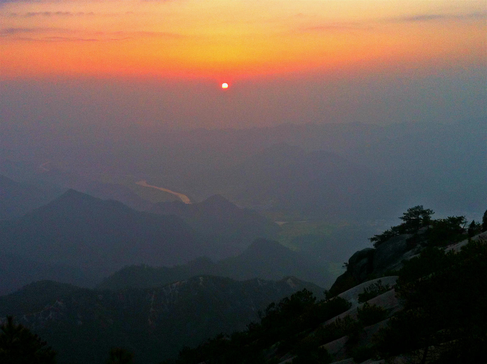 夕阳西下,站在山脊上,欣赏落日余辉。