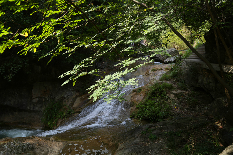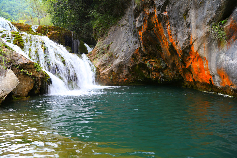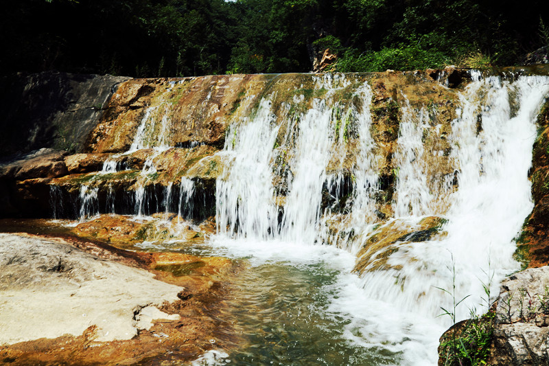 九个瀑布各有特色,趟过膝盖深的溪水有些冰凉,溪水时而湍急时而舒缓,清澈碧绿。溪水中的钙化的石头,些微呈古铜色,在阳光的照射下,分外夺目。