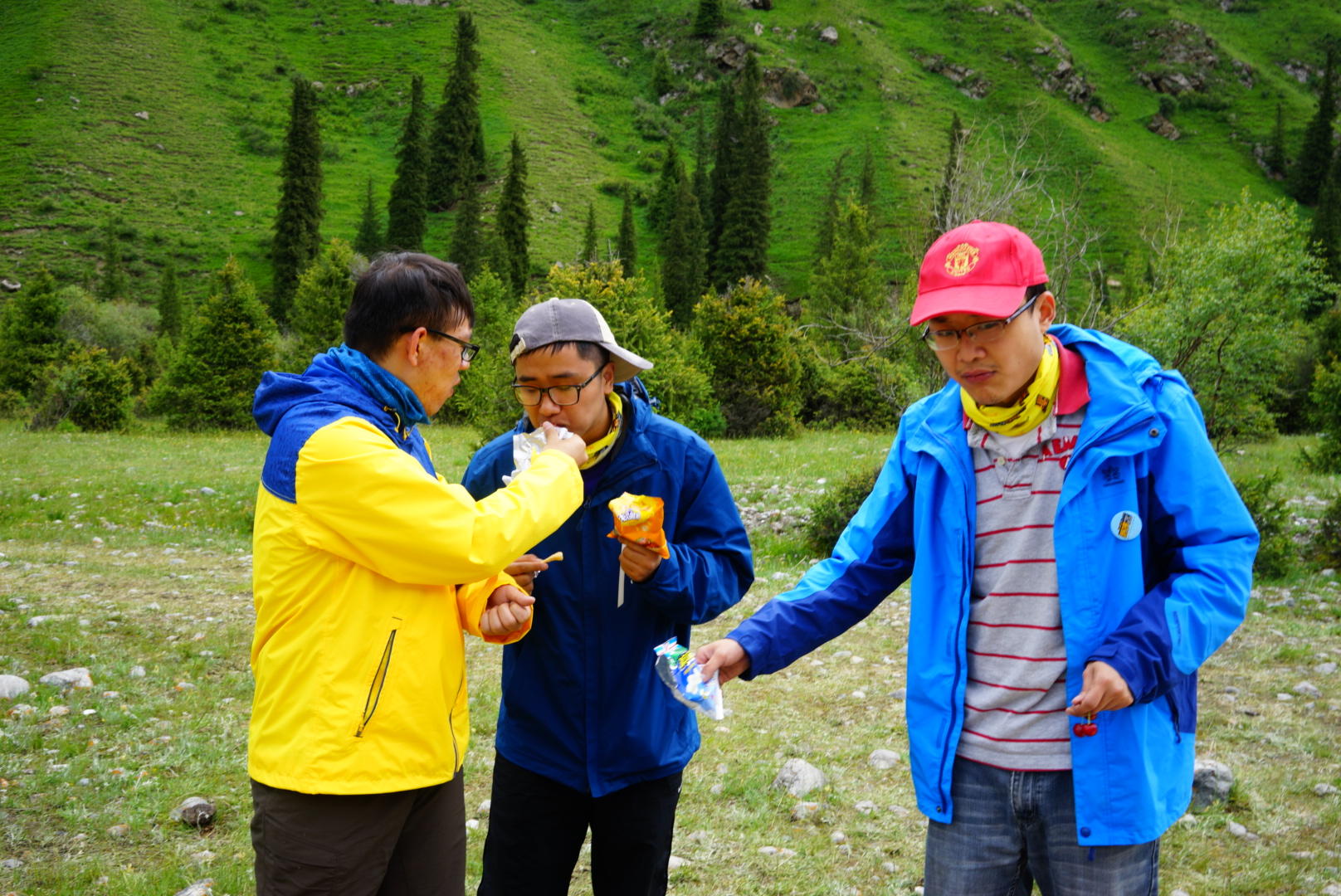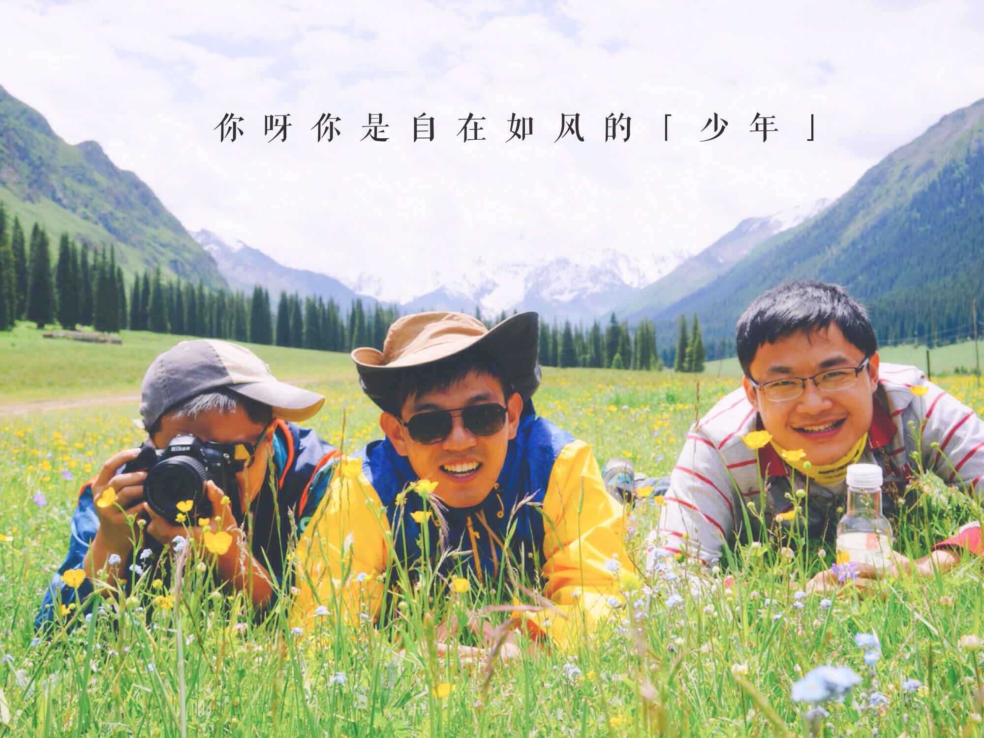 Bruce是我大学校友,Bill是Bruce的同事,Dr.Ye是Bruce的发小。因为五月的一场婚礼,我无意间和Bruce谈起徒步天山,于是这三个小鲜肉就这样被我忽悠来了。洋气的名字背后也是霸气侧漏。两位在四大忙得昏天暗地的审计师和一位刚浙大毕业即将奔赴巴黎念医学博士的学霸,被放逐到天山下的草原后,一个个都成了调皮的孩子。如风的少年呀,愿你前程似锦,愿你在世俗的洪流中,仍然保有如雪山般纯净清澈的心。