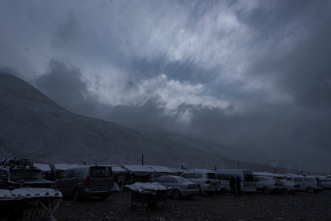 远处巨大的云块下面正下着雪,西藏的天气就是这样说下雪下雨马上就下,而且是小区域的下,相距几十米可能是二种截然不同的天气。