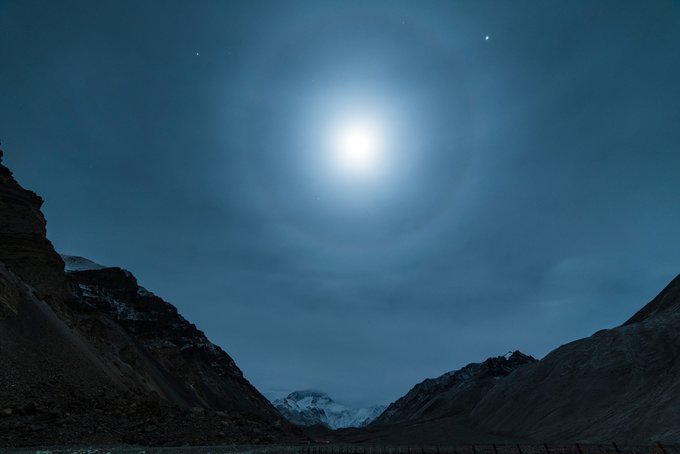 当晚因为雪后雾气没散,便有了月晕,下面的雪山则是珠峰