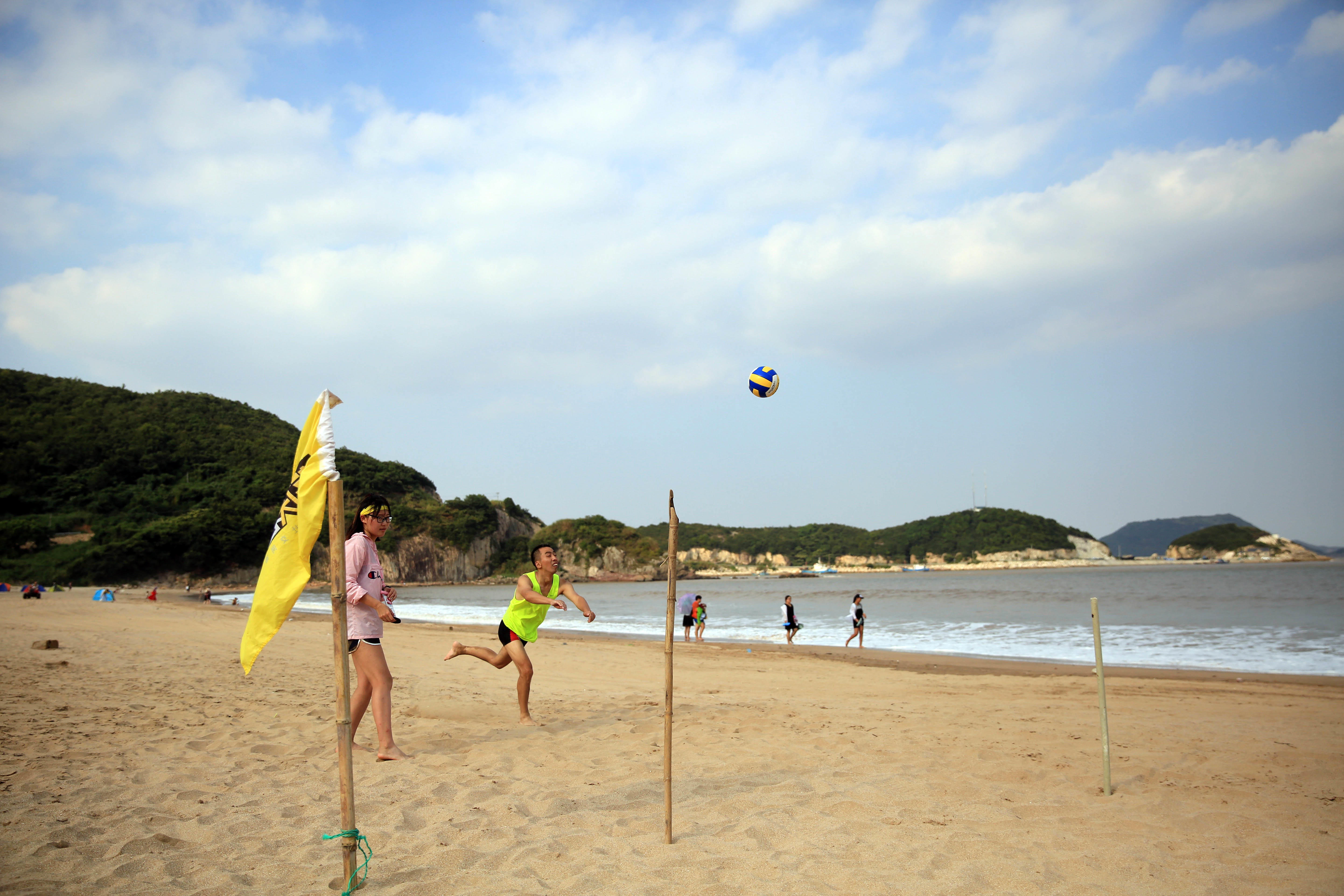 【象山五彩海滨沙滩】三面环山,海岸线全长约2.5公里,沙滩尚未开发,保持原始自然状态,天然而淳朴,沙质细腻,是夏天周末休闲的绝佳去处。附近有人迹罕至的火山岩地貌徒步,地质构造奇特。