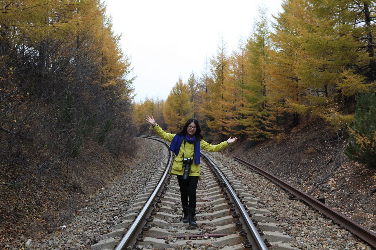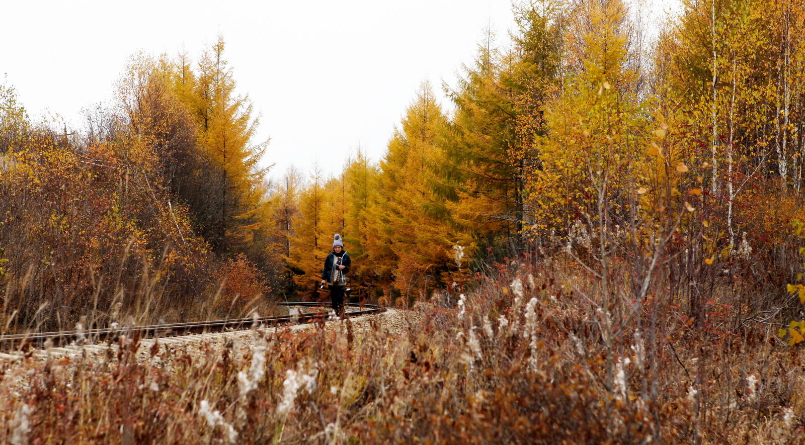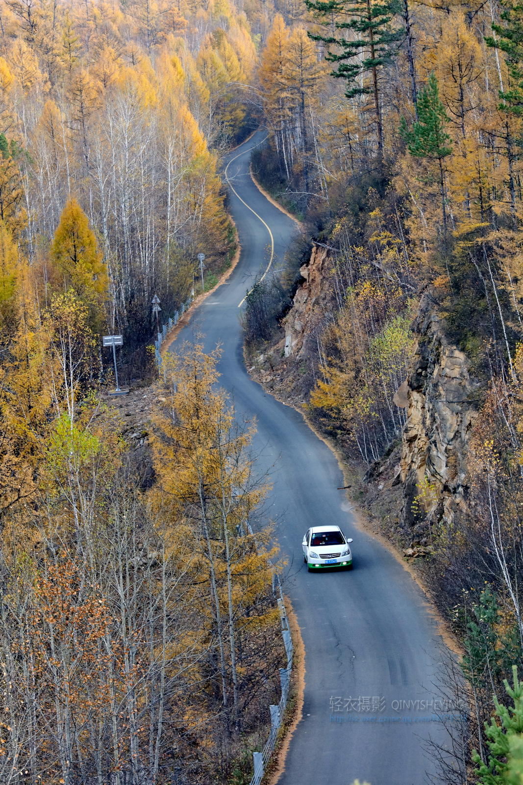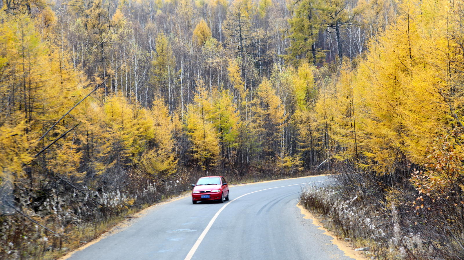 出了莫尔道嘎小镇不久,就有一条废弃的弯弯的铁轨,大家大呼停车,于是焦师傅将车停在安全处,大家下来各种造型各种姿势拍拍拍。今天的天气预报是小雨,一路阴天,继续前行时,却偶见几点雨点飘落在前挡风玻璃上,心里暗自叫苦,没有光的白鹿岛,色彩便会逊色很多的。路上两旁风光旖旎,金黄的落叶松和白桦树交相争艳,迎风招展,让人目不暇接,还是一样的狭窄山路,不适合停车,只能车上拍一拍。