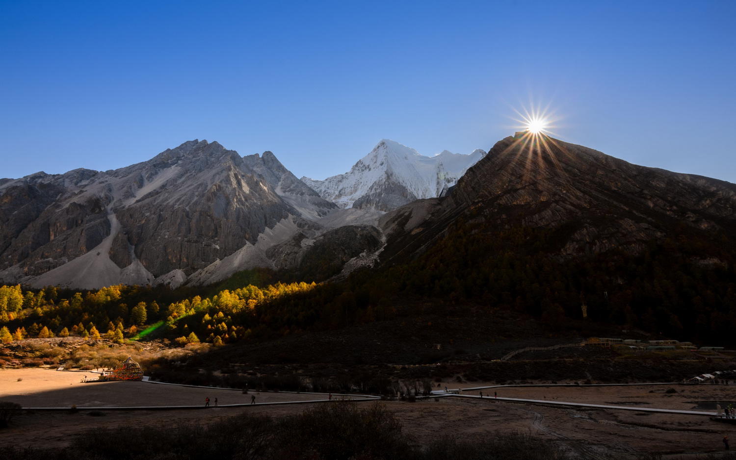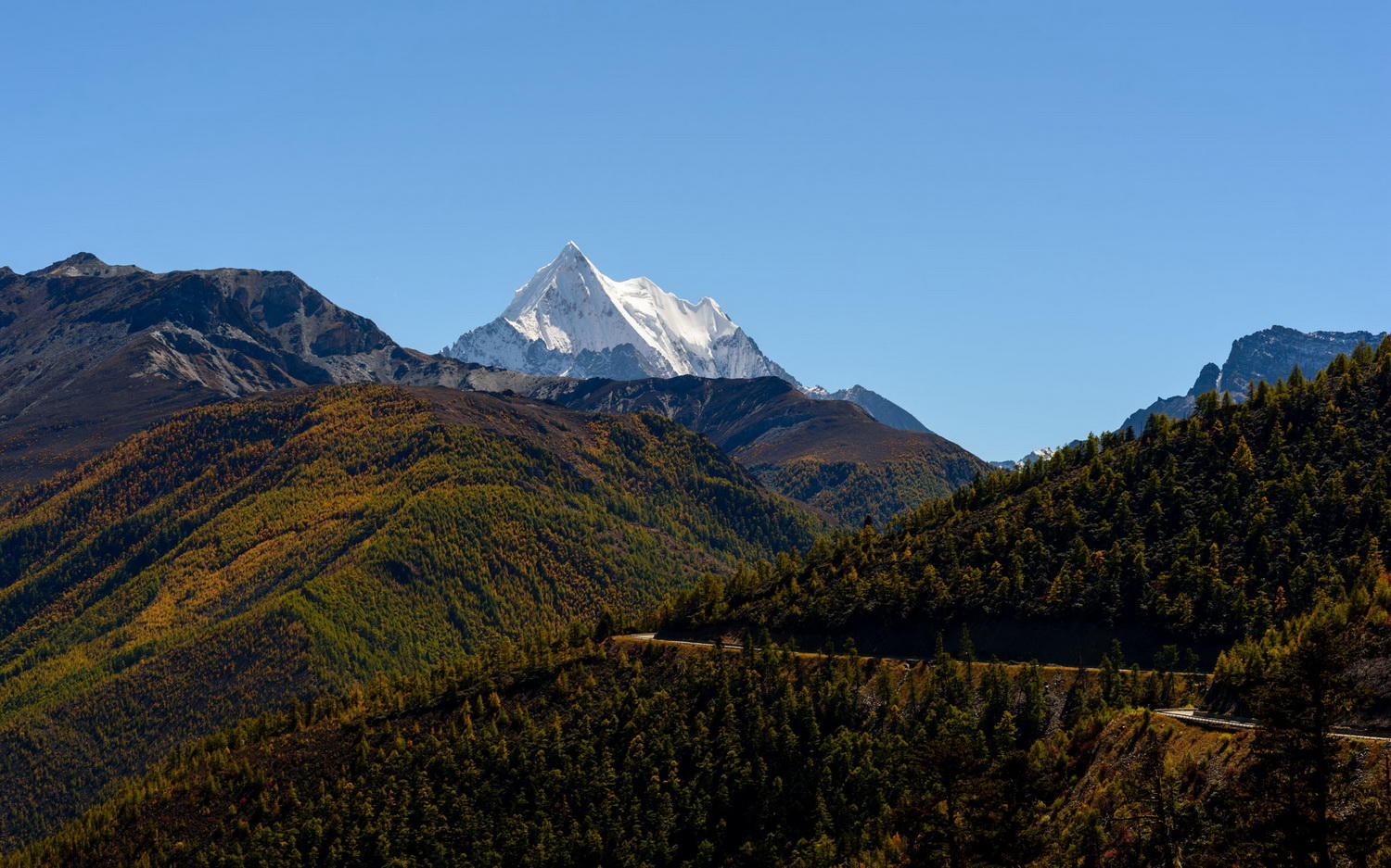 新都桥有一处贡嘎雪山观景台,距离雪山虽远,不过在彩林的映衬下也别有一番风味。我们在这里等待贡嘎的日照金山,日落后下山,返回酒店,入住休息。