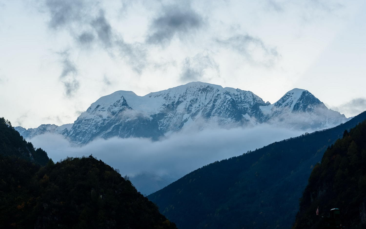 第二天清晨,再度踏上征程,为了一睹贡嘎真容,凌晨5点同几位队员一起出发,前往子梅垭口。守候日出,等待奇迹的出现。最后虽然依旧未能见到贡嘎全貌,不过也算颇有收获。云雾下的贡嘎若隐若现,经常是出现几十秒就再度隐匿,所幸记录下了这一刻。