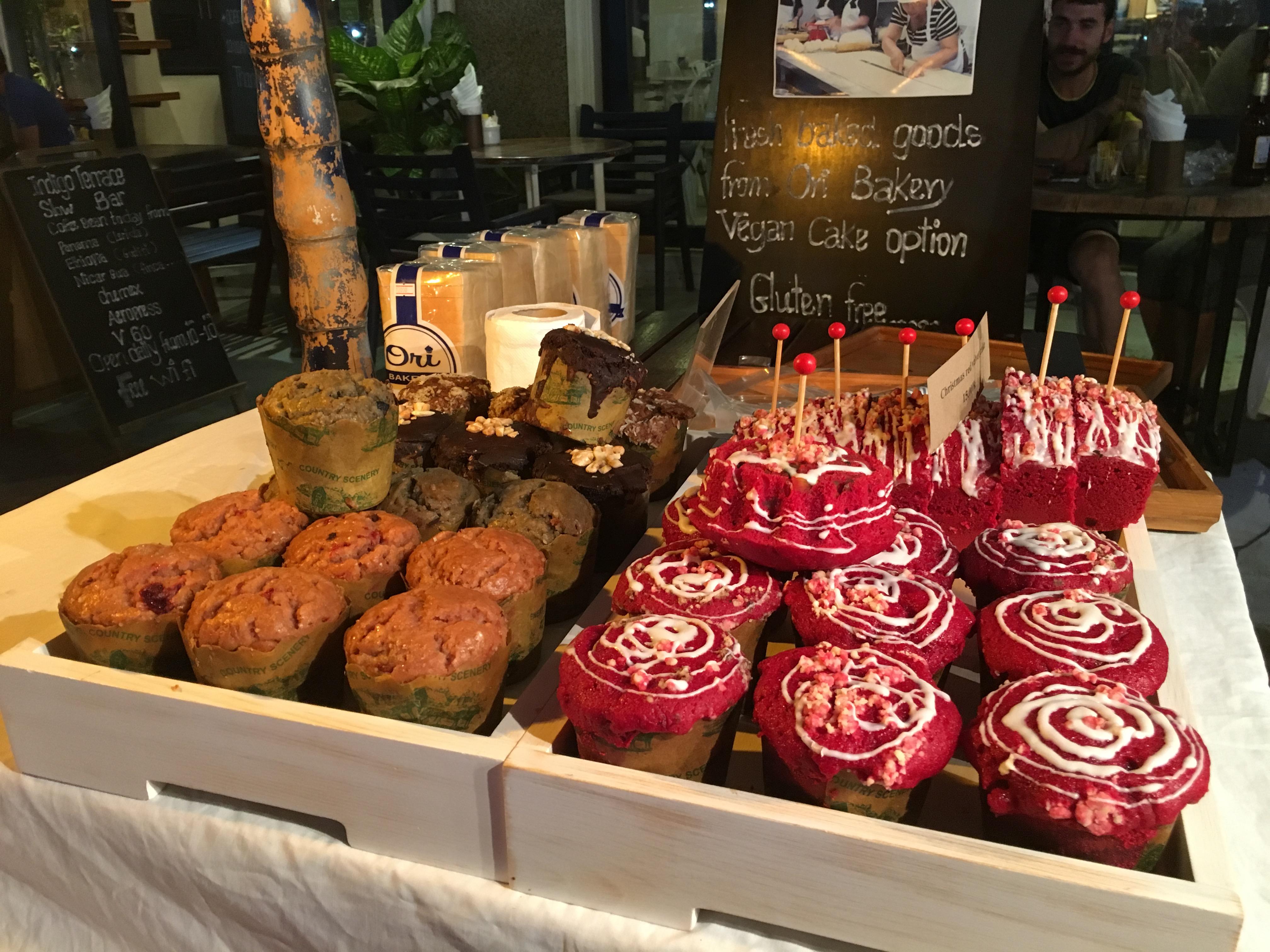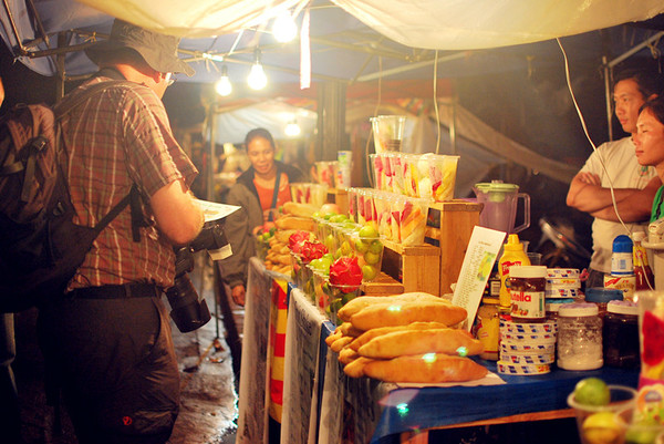 Th Kitsalat街与河畔之间的Th Chao Phanya Kang街每晚都会有小吃夜市,著名的素餐buffet便在这里。落座后摊主给你一个盘,由你自己动手在盘子里任意装满你想吃的蔬菜和各式主食。素餐价格为10000基普/人,只能盛一次,烧烤的肉类食物需要单独付费。