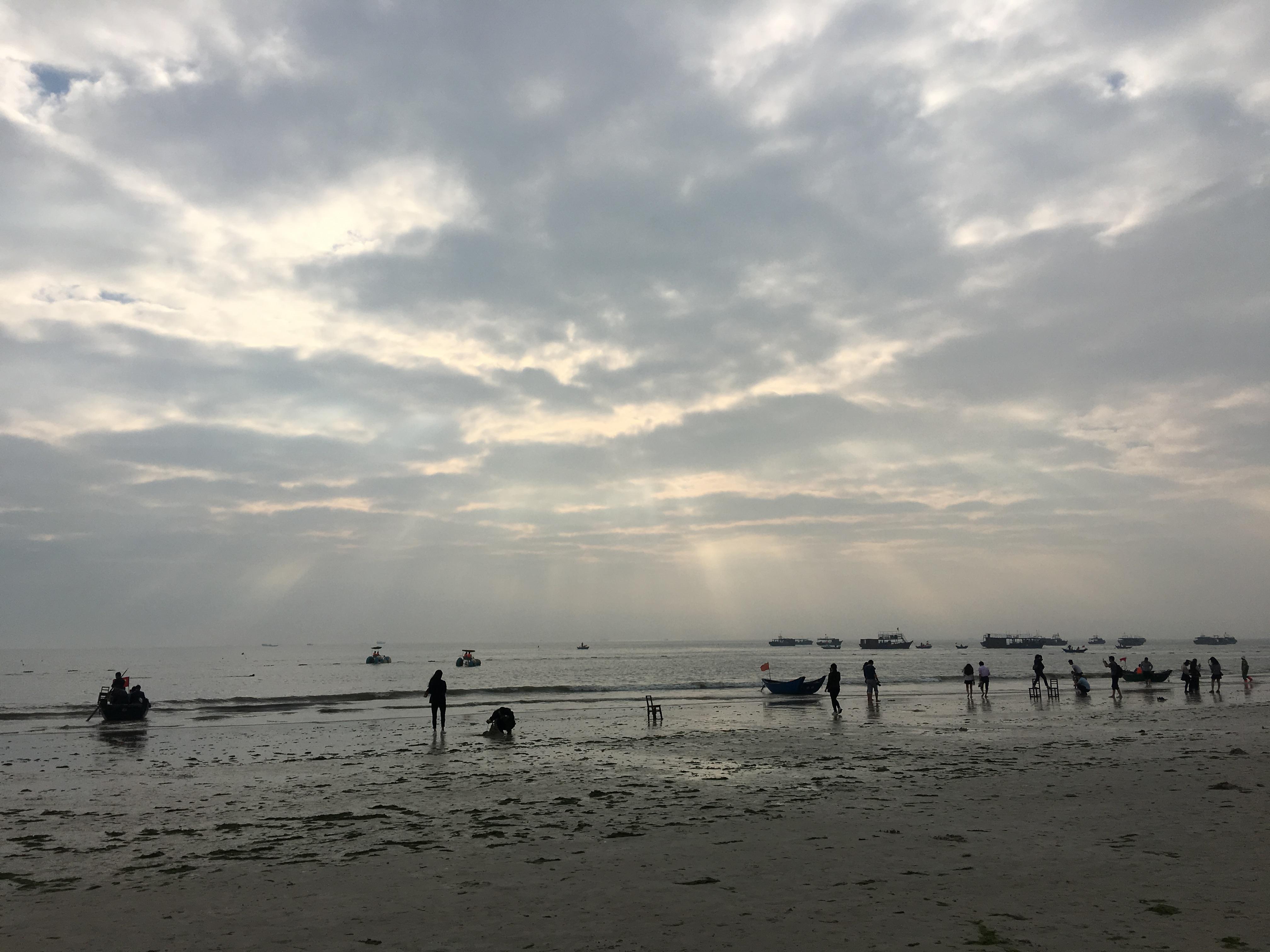 夕阳西下的北海银滩,阳光穿透云层,似佛光普照大地,乌云在岸的一边迟迟不敢上来,就这样分割两天~