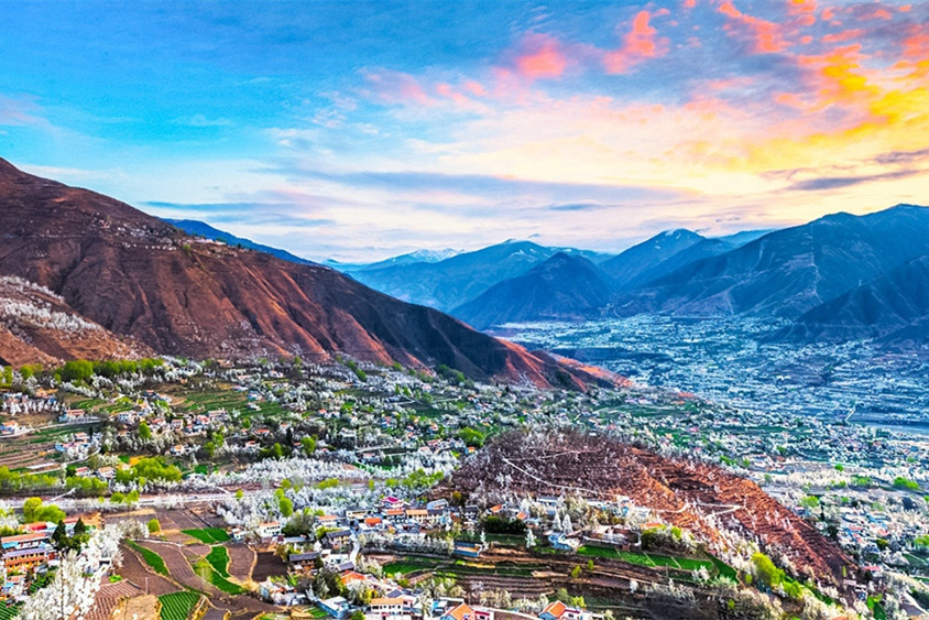 半山坡地,漫山遍野都栽种梨树,每到仲春三月,万亩梨花在碉楼藏寨边绽放,绵延百余公里的金川河谷两岸粉装玉砌,美