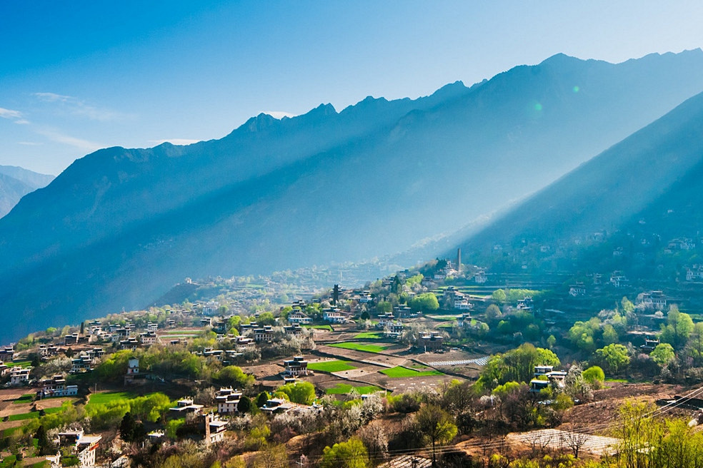 阳光斜射,照耀着山上一幢幢极富层次感的藏家小楼,默尔多神山下的村庄在