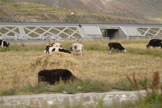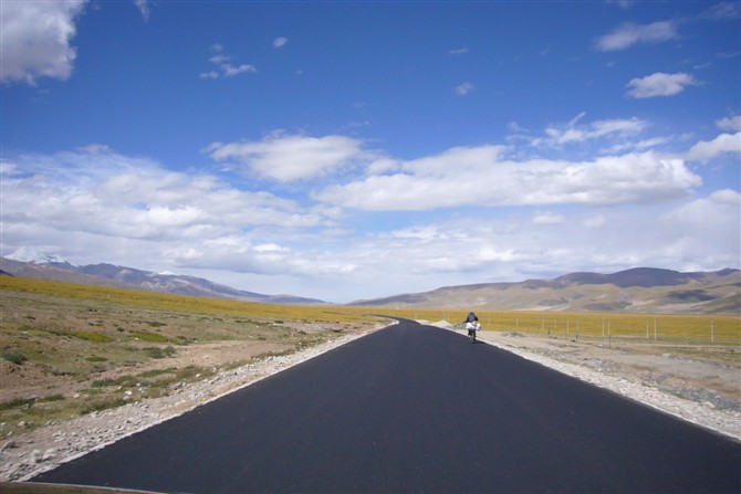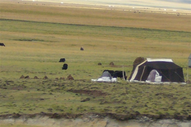 从当雄出发到那曲已是下午6:00,因为限速,我们得以欣赏沿途的景物,青藏公路伴随着青藏铁路在高原草地上延伸,从拉萨往北走,草场不再是被高山包围的,因为海拔比较高,一望无际的草原上,高山只是草原上突起的一连串的山包。草原上,白的黑的花的羊和牦牛散在草原上,远远看去就象金色画毯上的一个个活动的小点,还有一个个矮矮的帐篷。青藏公路就象一条黑黑的线,将草原划成两半,青藏铁路却象一个顽皮的孩子,时而钻进山洞,时而和青藏公路并肩而行,时而又凌驾于公路之上腾空而去,给草原上的牲畜留下迁徙的空间。
