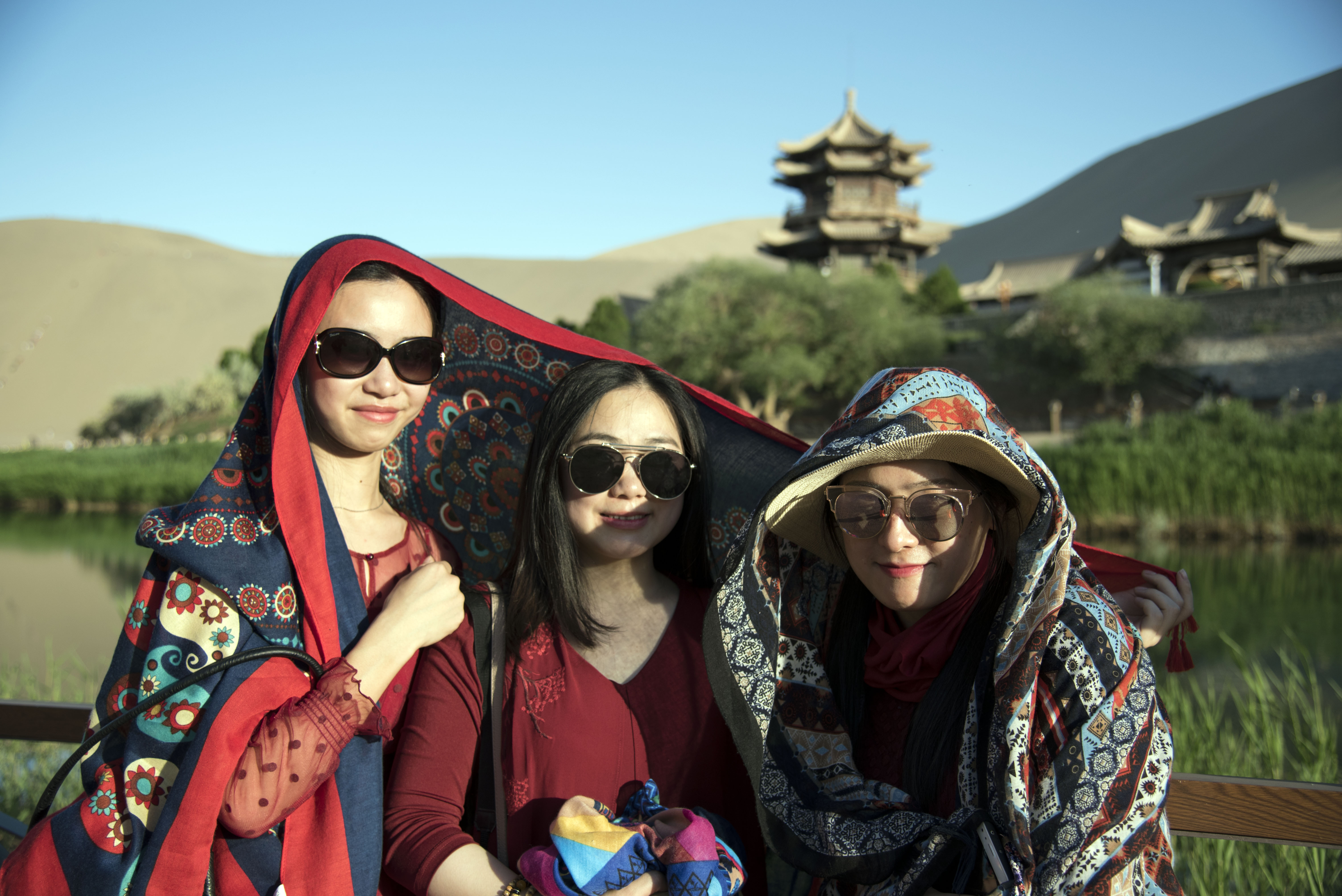 月牙泉位于甘肃省敦煌市城南5公里的鸣沙山北麓。古往今来以“山泉共处,沙水共生”的奇妙景观著称于世,被誉为“塞外风光之一绝”。泉形酷似一弯新月,故名月牙泉。泉被鸣沙山四面环抱,但并不为流沙所掩,始终碧波荡漾,清澈见底,久雨不溢,久旱不涸,泉内星草含芒、铁鱼鼓浪,山色水光相映成趣,风光十分优美。它的神奇之处就是流沙永远填埋不住清泉。