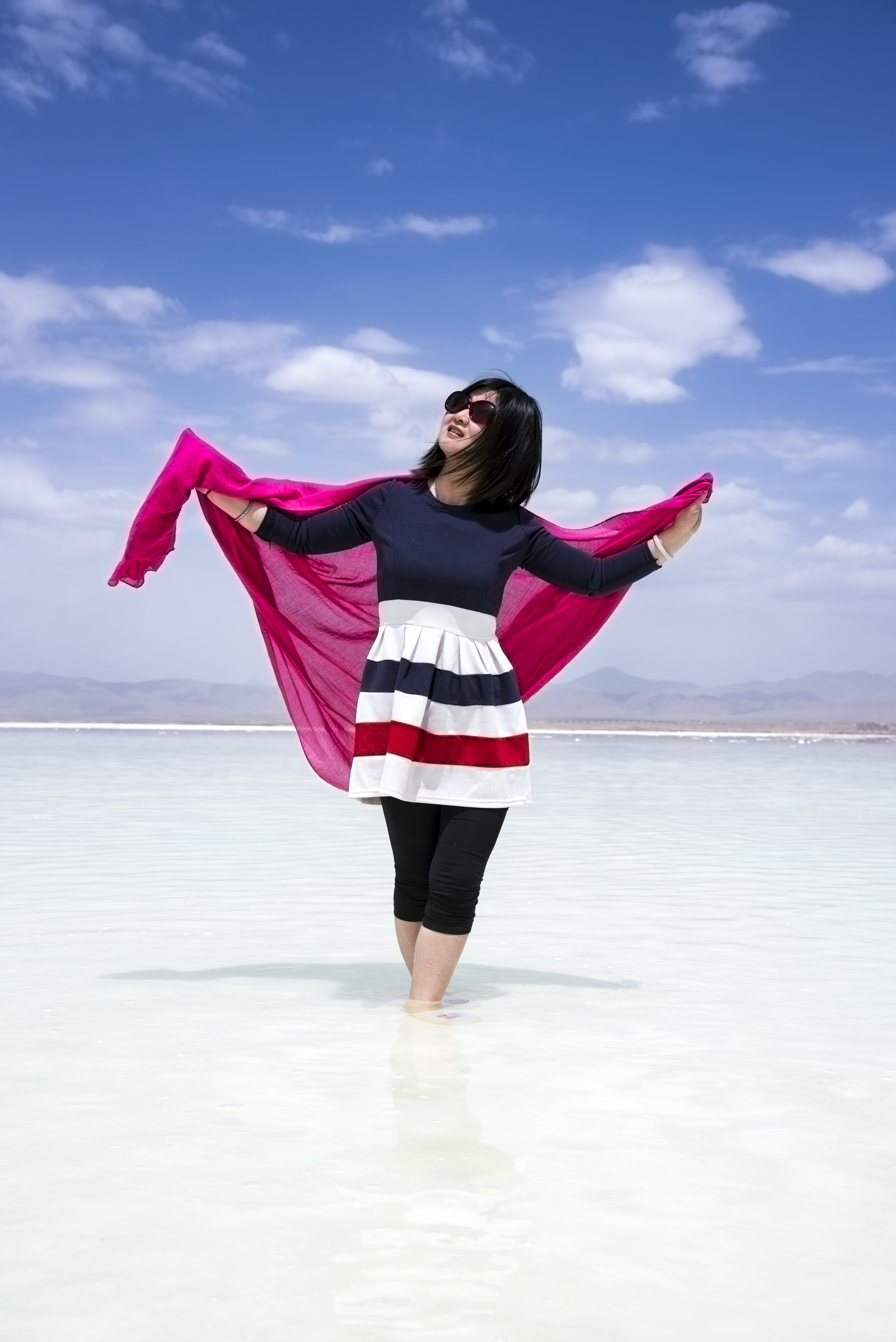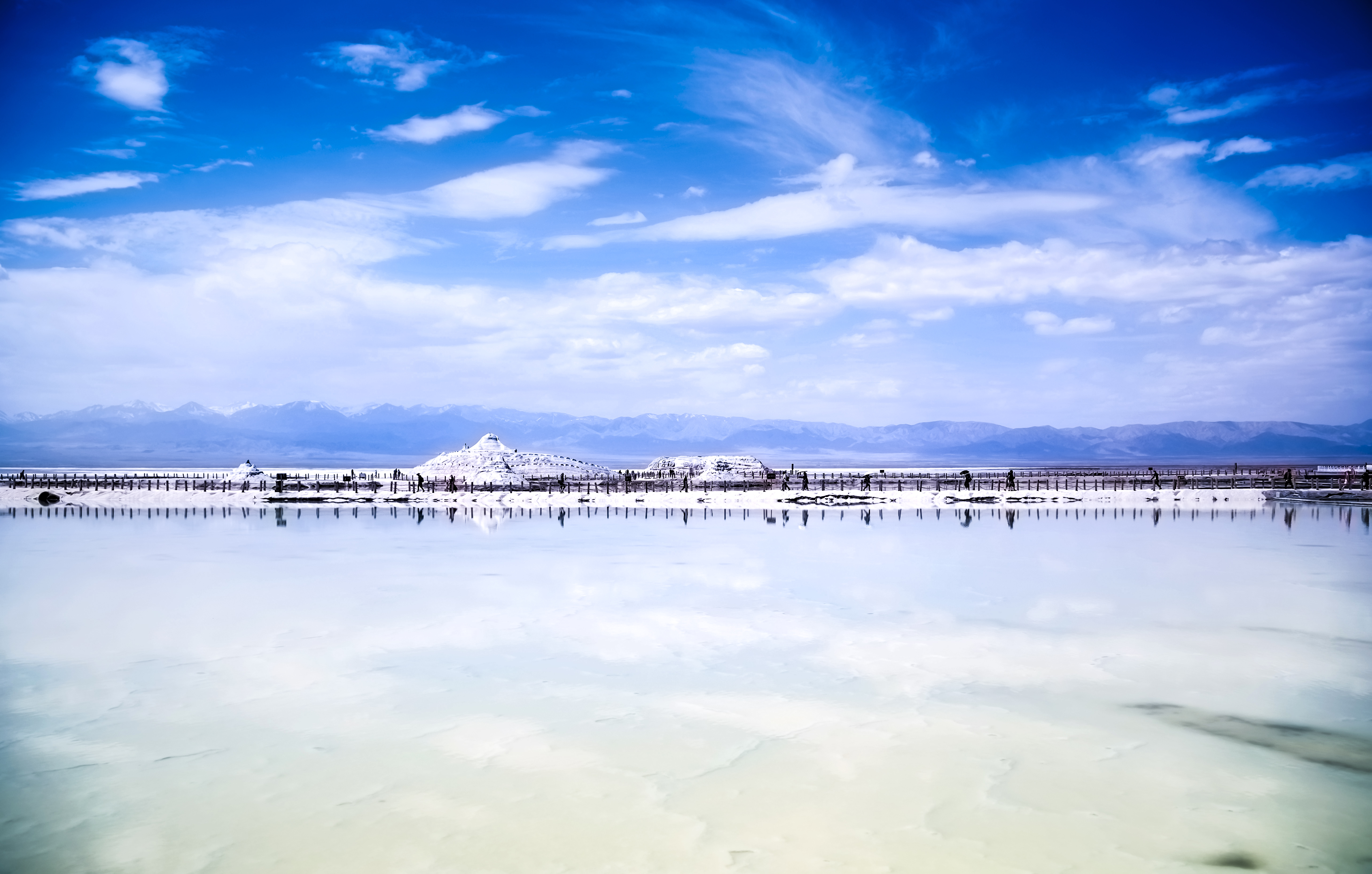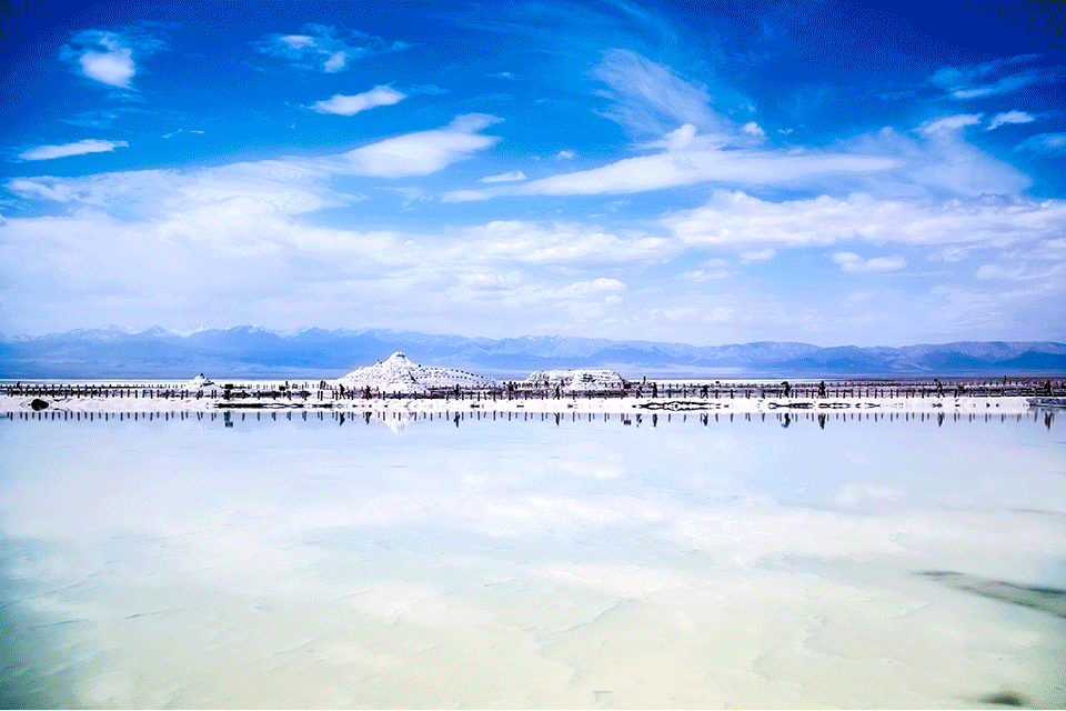 茶卡盐湖是柴达木盆地有名的天然结晶盐湖,被誉为中国的“天空之镜”,盐湖水域宽广,银波粼粼。天空白云悠悠,远处苍山峥嵘,蓝天白云、雪山映入湖中,如诗如画。四周牧草如茵,羊群似珍珠洒落。漫步湖上,犹如进入盐的世界。被国家旅游地理杂志评为“人一生必去的55个地方”之一。