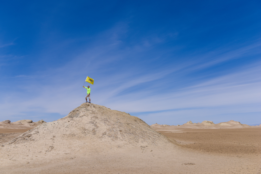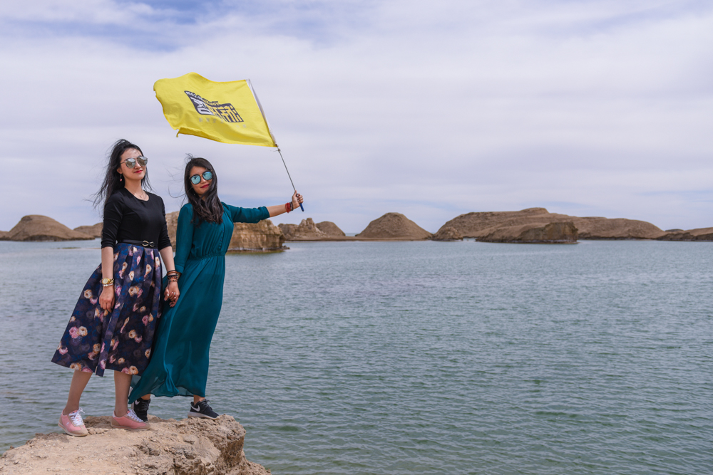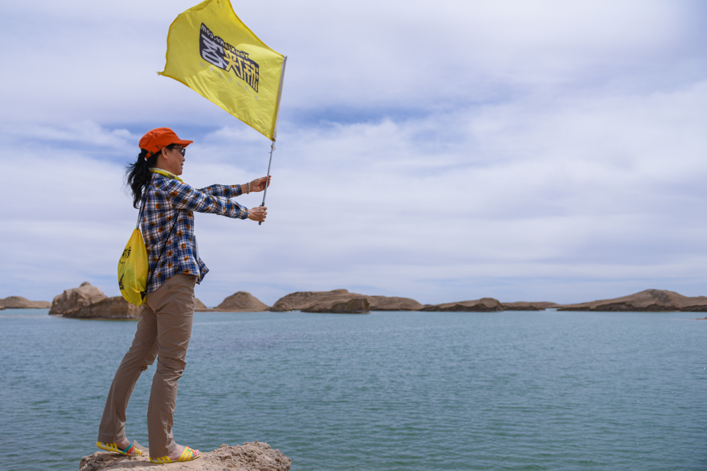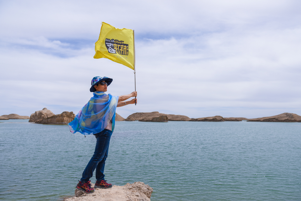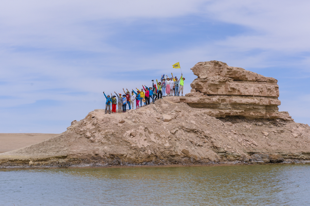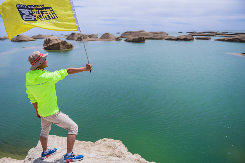 抵达西北秘境水上雅丹,游侠们登高远望,游侠客大旗迎风飘扬