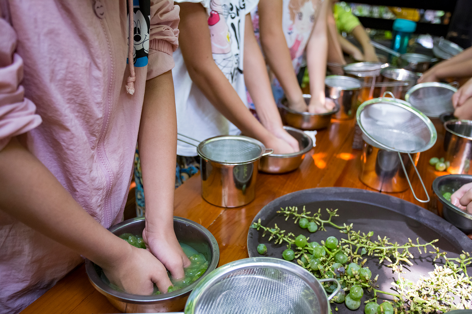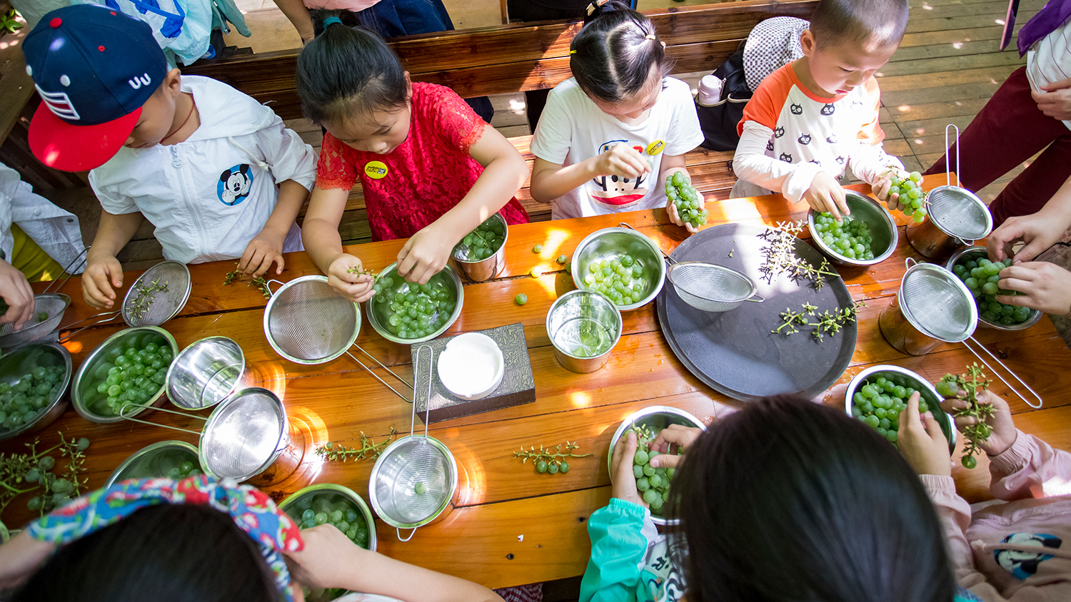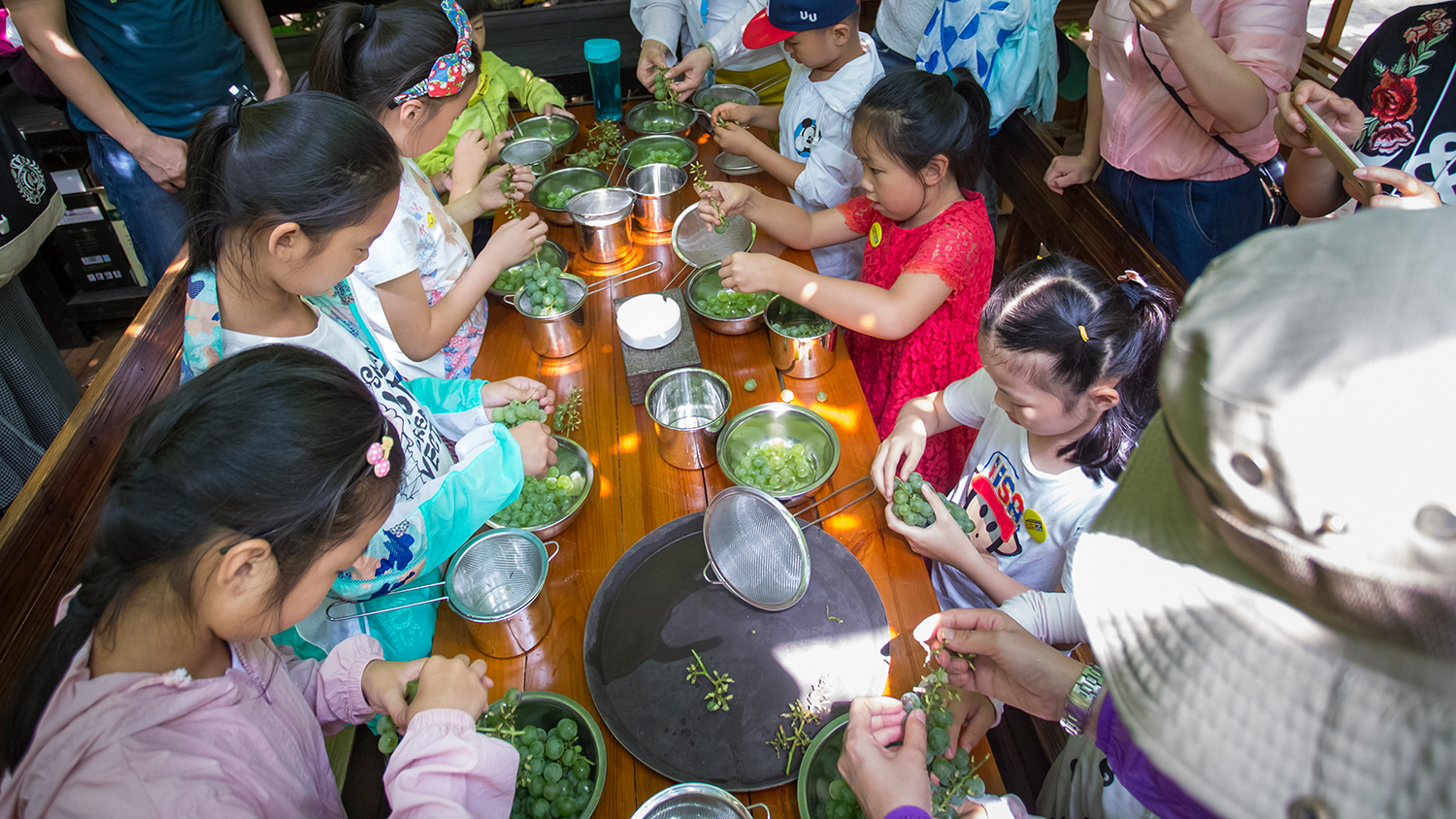 小游侠们把葡萄一颗一颗摘好放进盆里,开始制作葡萄汁
