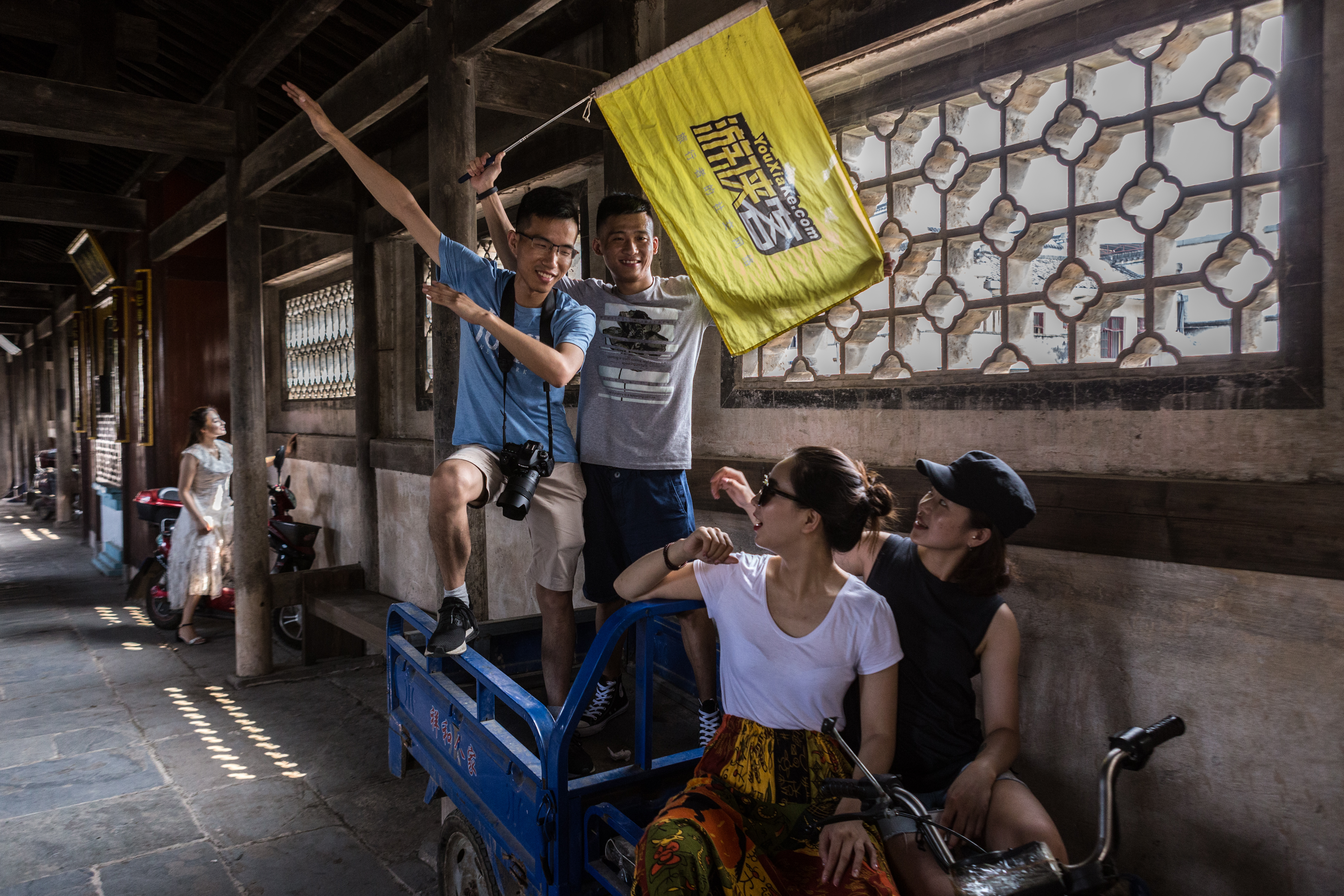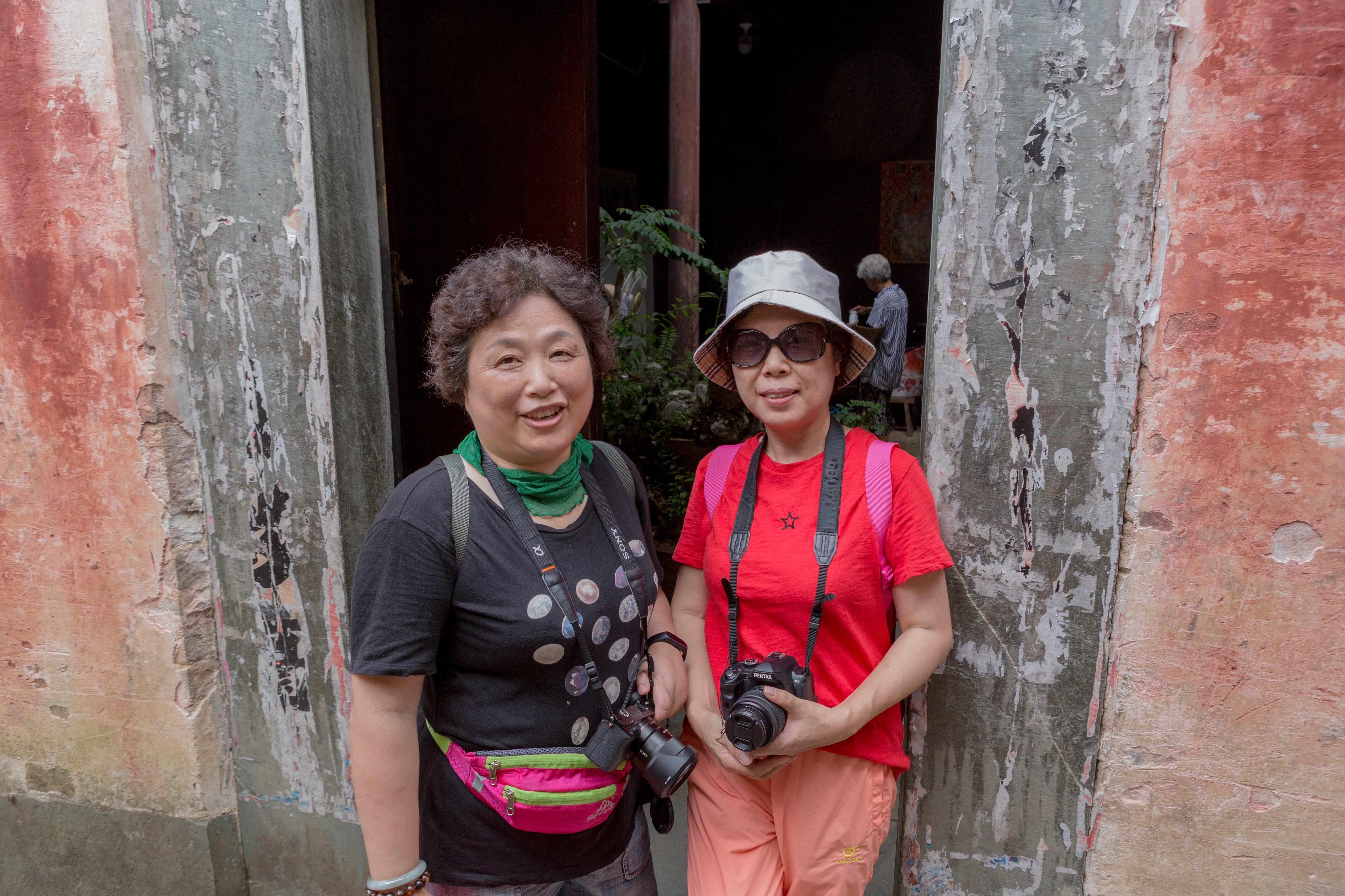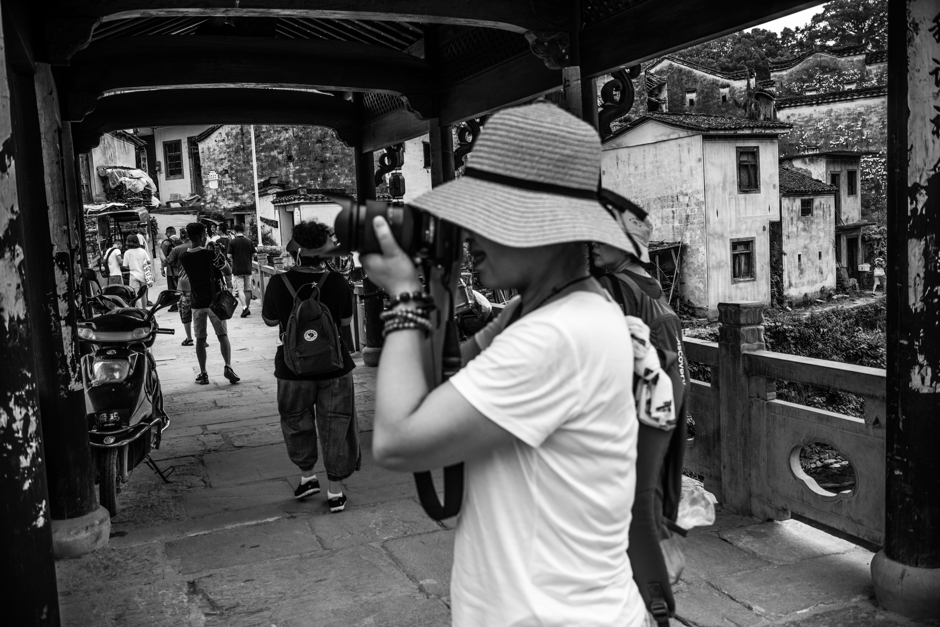约三个小时我们到达石潭村,午饭后,我们前往石潭老街,从石潭大桥廊亭上方镌刻“石潭老街”算起,村中街道两旁老房子分别悬挂了“糕点铺”、“茶叶铺”、“竹器铺”、“农家茶”、“剃头铺”、“布鞋铺”、“古玩店”、“徽州盆景”等二十来个形形色色的复古招牌,加之大街上的两座古老祠堂——叙伦堂和春晖堂,让游客们感受到古色古香的石潭村悠久的历史。只有正午的太阳才能透进窄窄的巷子,拍摄到光与影的交融