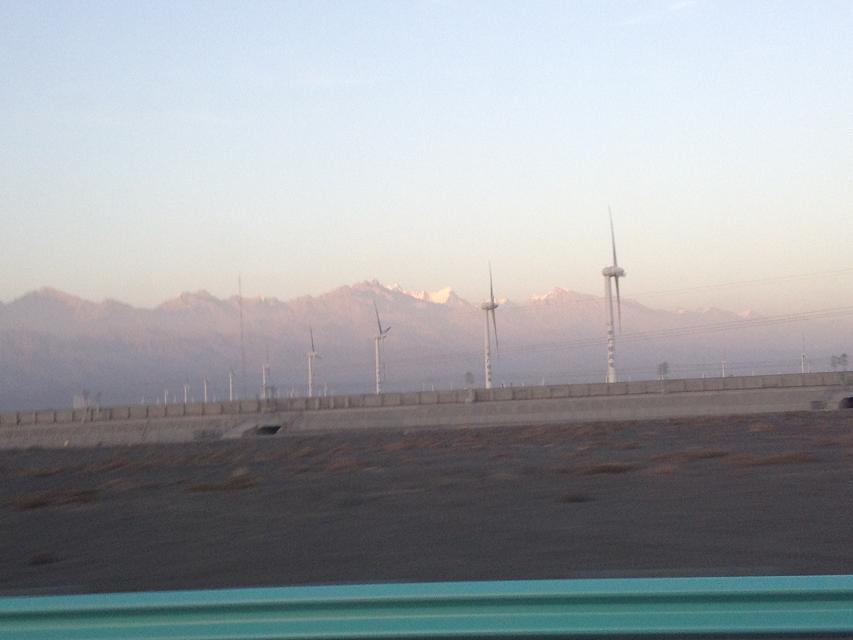 从达坂城到托克逊的路上是成百上千的风力发电机,一望无际的戈壁滩上,一眼望不到头的“大电扇”该是多么壮观。他们说这里山口,是一个“风窝子”,是我国最大的风力发电场。路上没有停车,只用手机在高速行驶的车内拍了一些照片,不甚清晰,算是一个留念吧。