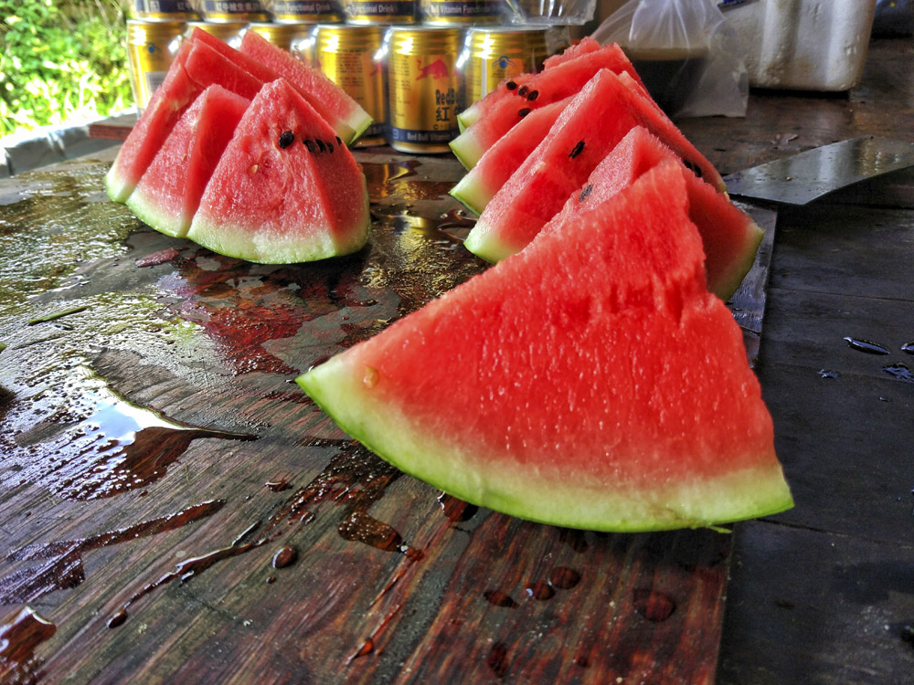 一路上山,各个被汗水湿透,所幸有好几个补给点,来两个西瓜不要太爽!