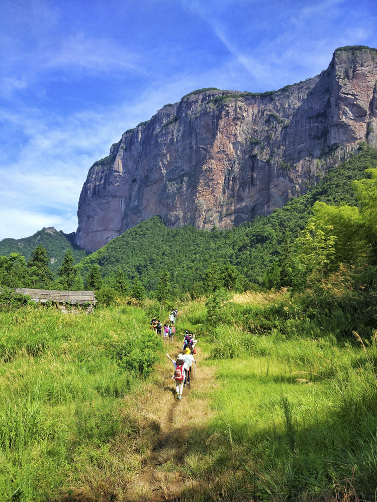 几百米高的山岩巍峨耸立,大家在讨论攀岩也不错