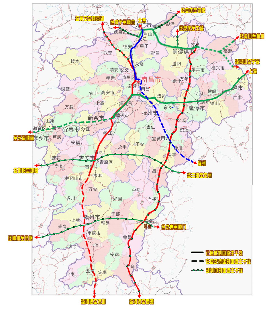 京广铁路线在南昌市中转车次;皖赣铁路线在贵溪市、鹰潭市、景德镇市(经过婺源县)中转车次。