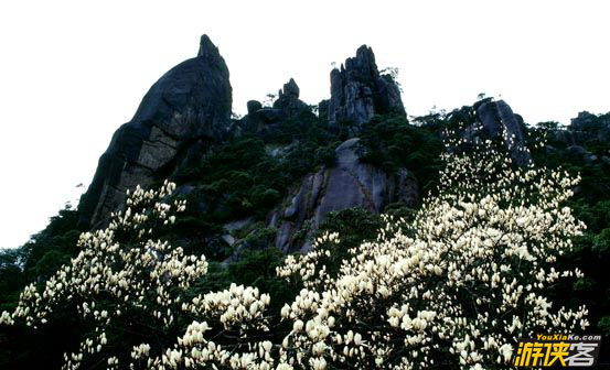 三清山特殊的地理环境和气候条件,养育了大量古树奇葩。景区内数量最大的三种古树分别是松树、杉树(尤以华东黄杉最为珍贵)和杜鹃。其中杜鹃因其数量大、面积广、种类多、花开得美且奇特而备受珍爱。