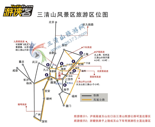 上(江西省上饶市)南(福建省南平市)铁路线直达上饶市或玉山县。